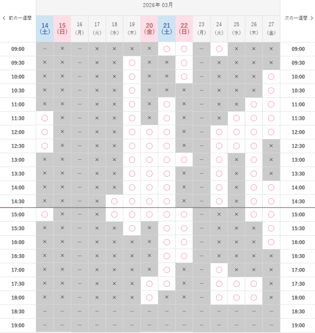 3月14日(土)から2週間先のご予約状況です。